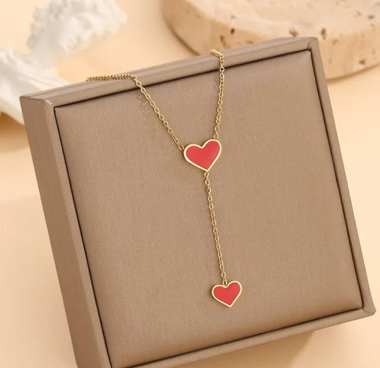 Collar dorado doble corazones rojos 12 y 10 mm X 45 cm con cierre extensible