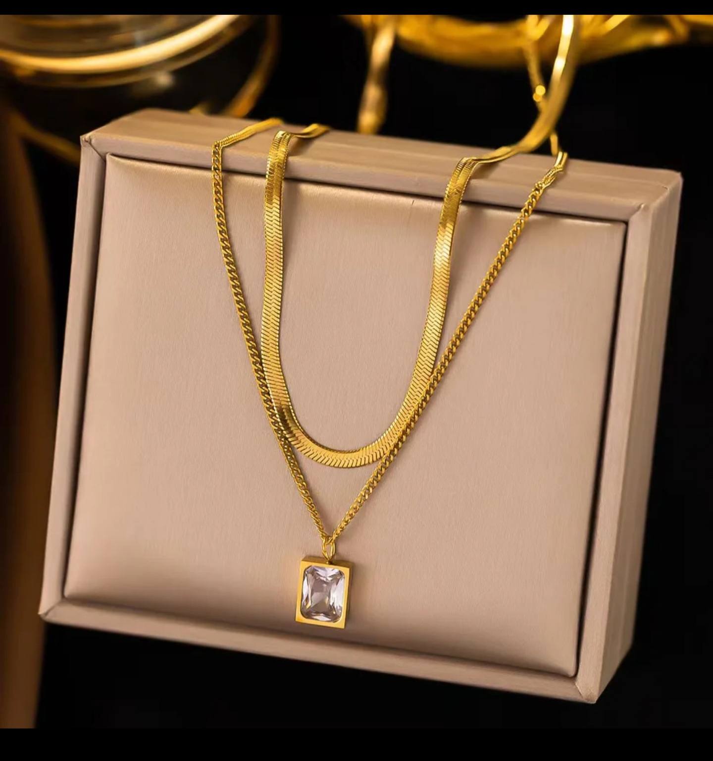 Doble cadena dorada Clapton 4mm x 40cm y chatita 1mm x 45 cm , cierre extensible con dije zirconia blanco 10mm x 8 mm